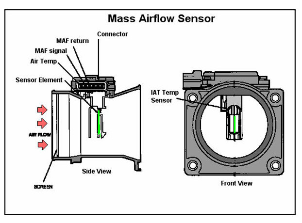 It s the device used in many fuel injected engines to measure the amount of air entering the engine so the onboard computer (ECU) can calculate the correct air/fuel mixture ratio to enter the combustion chambers. Located ahead of the throttle body, after the air filter, the MAF sensor uses a heated wire or filament/film to measure the air flow.